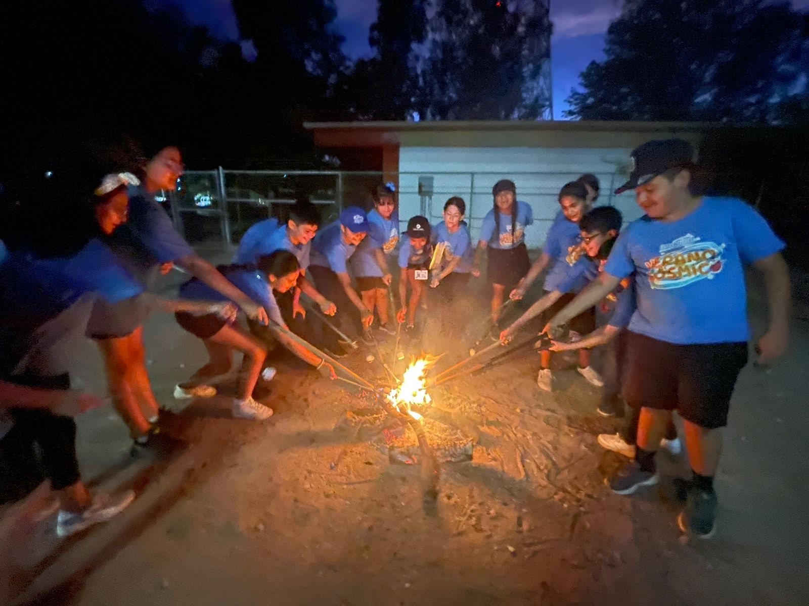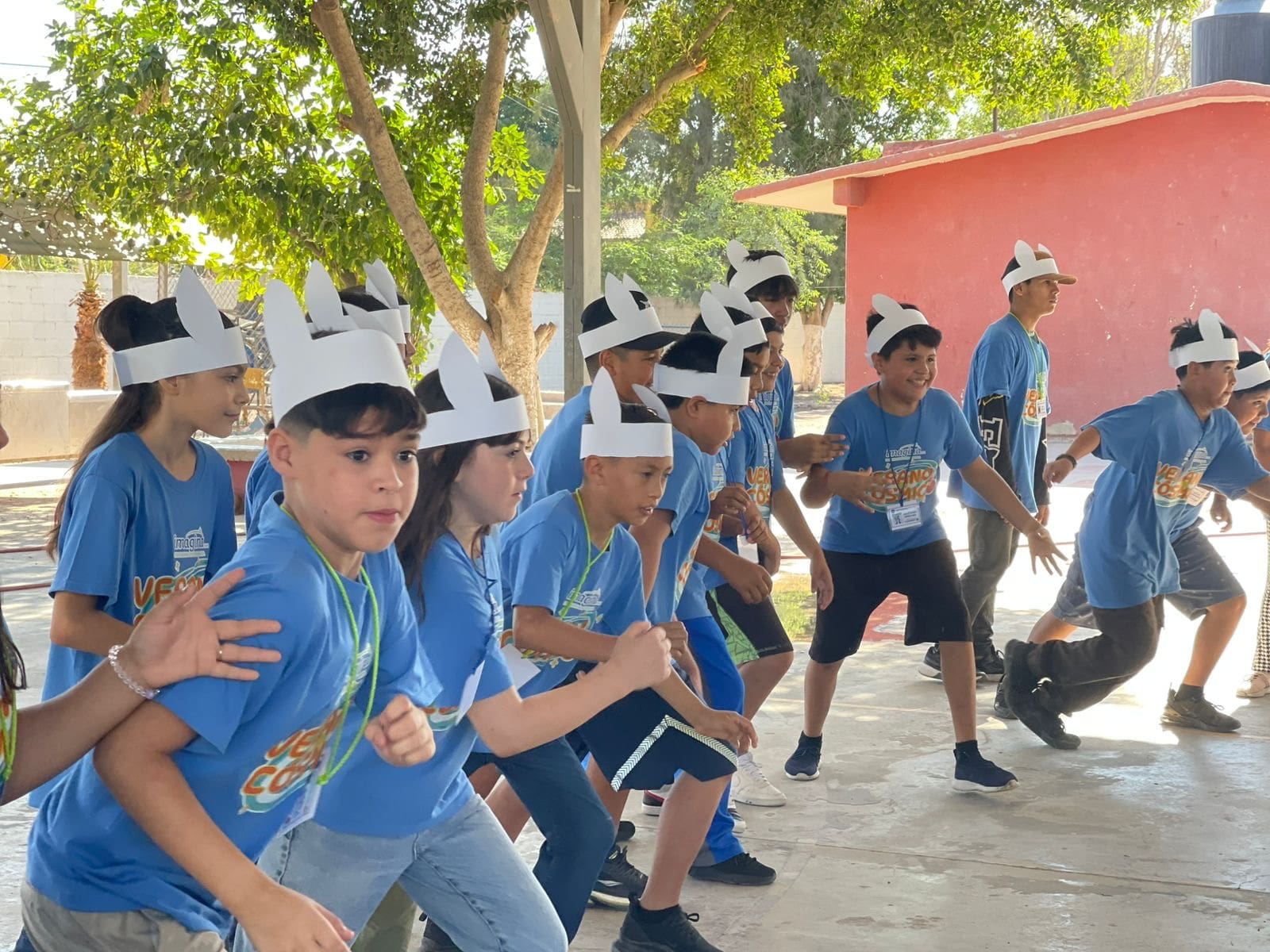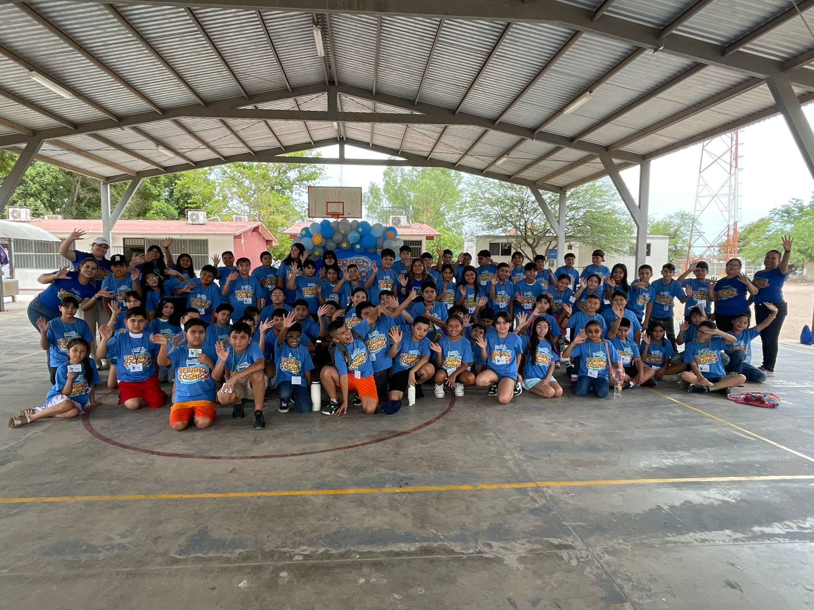 Grupo de niños y adultos en una foto grupal, posando con medallas celebrando sus logros durante el campamento.