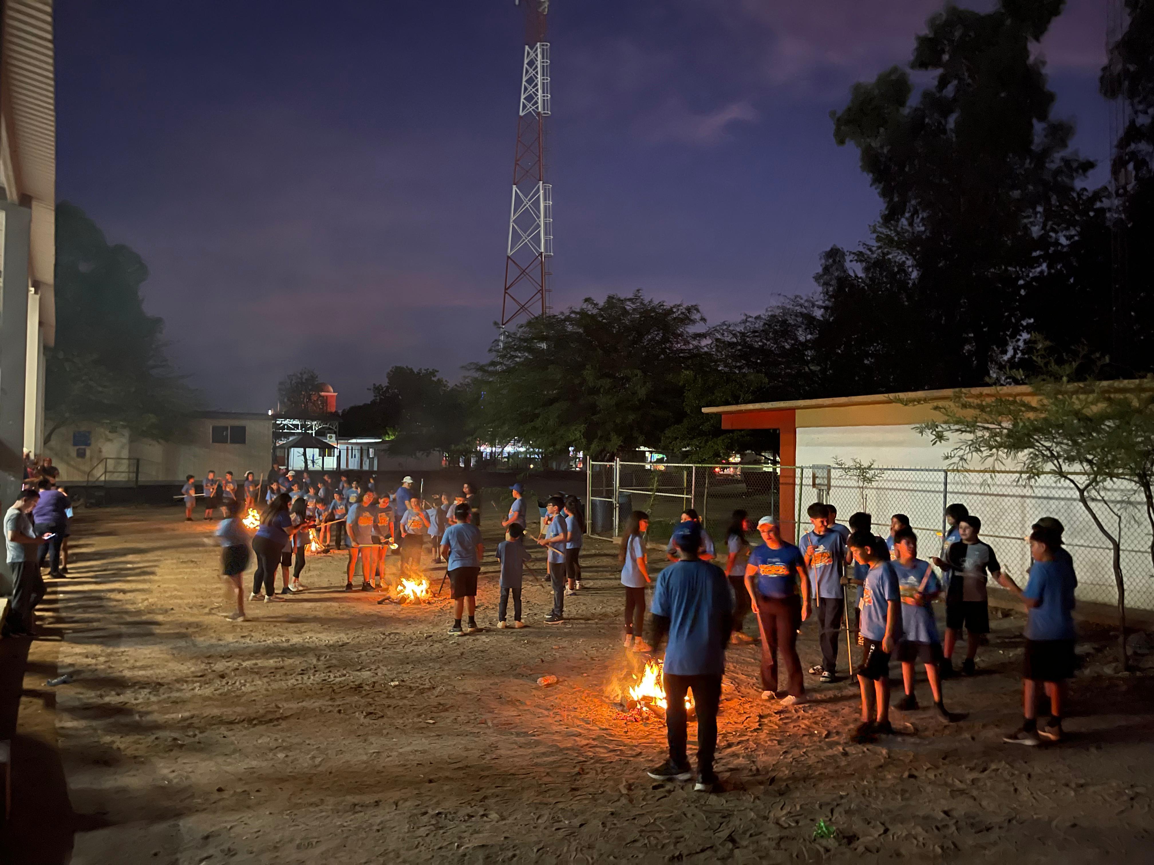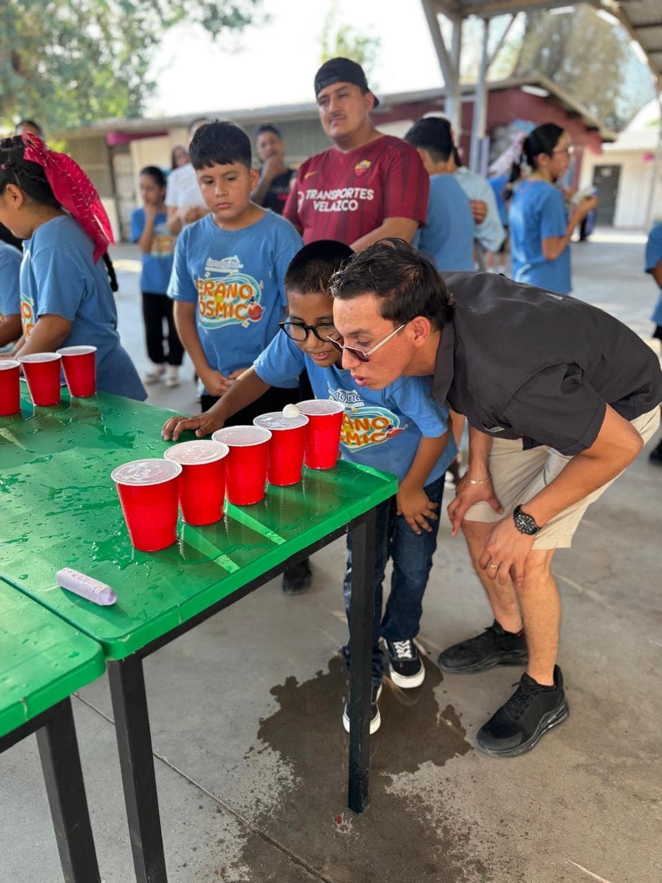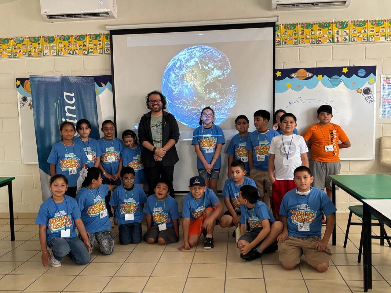 Grupo de niños y adultos en una foto grupal, posando con medallas celebrando sus logros durante el campamento.