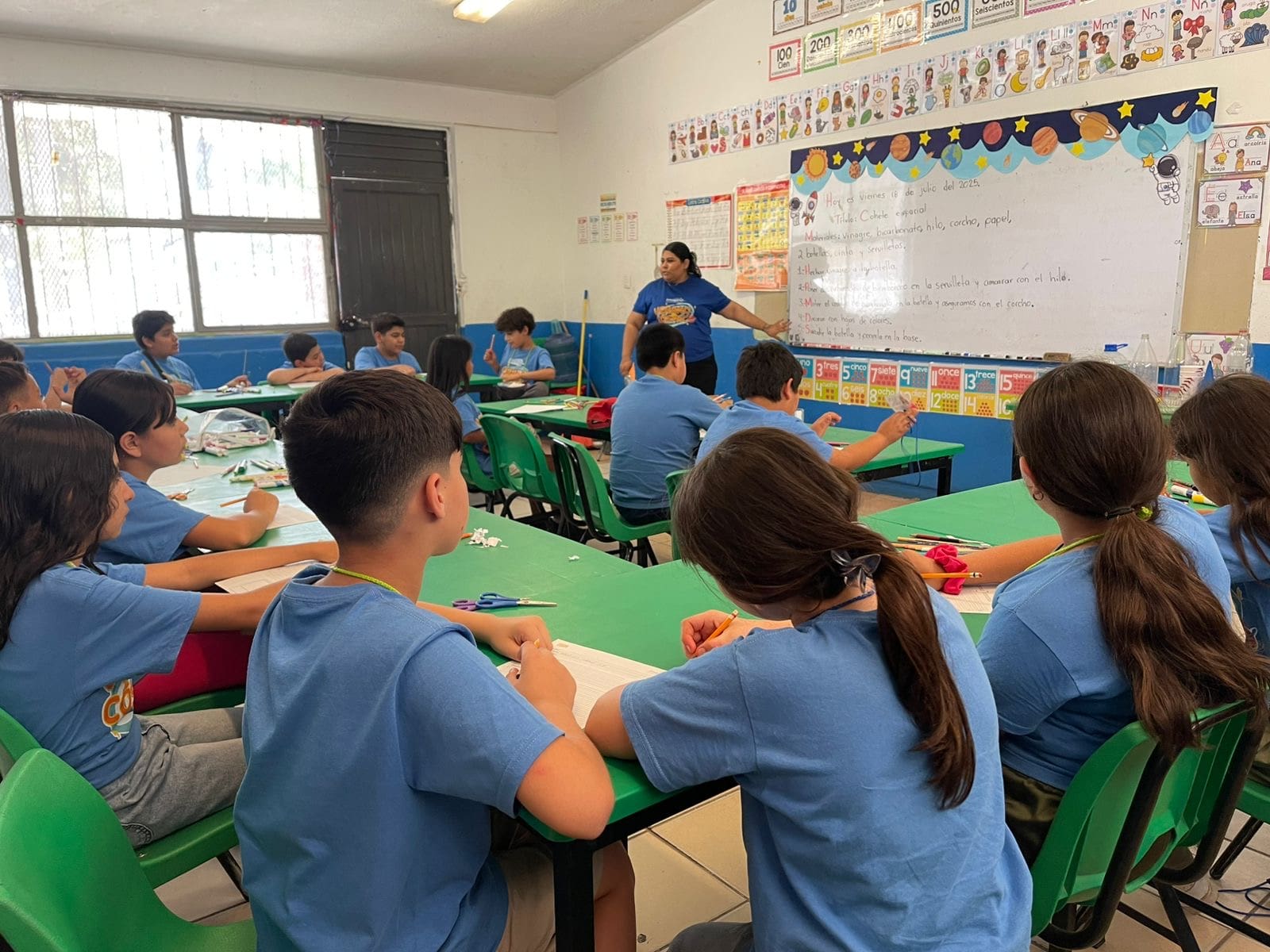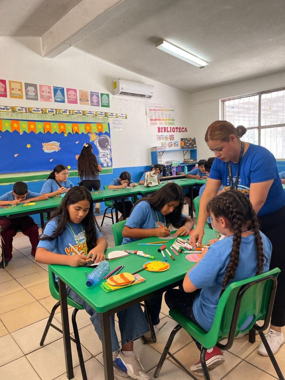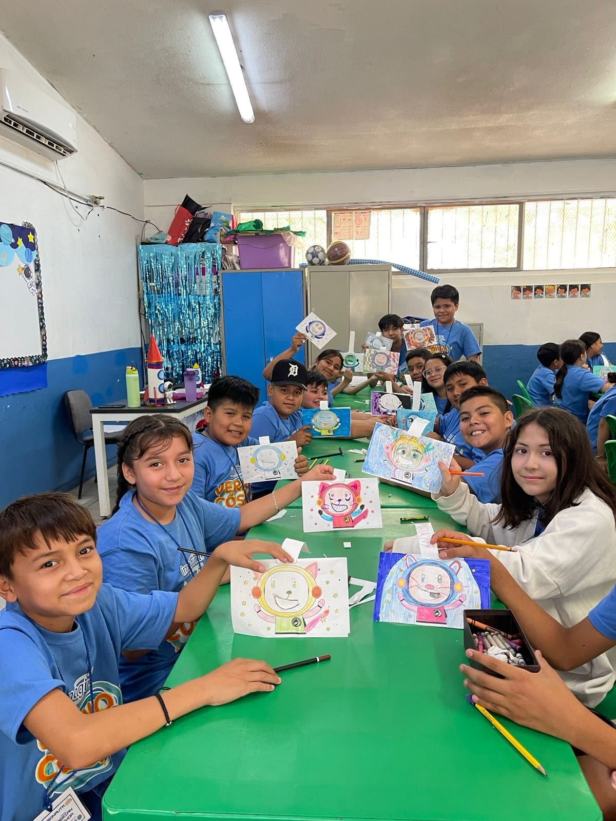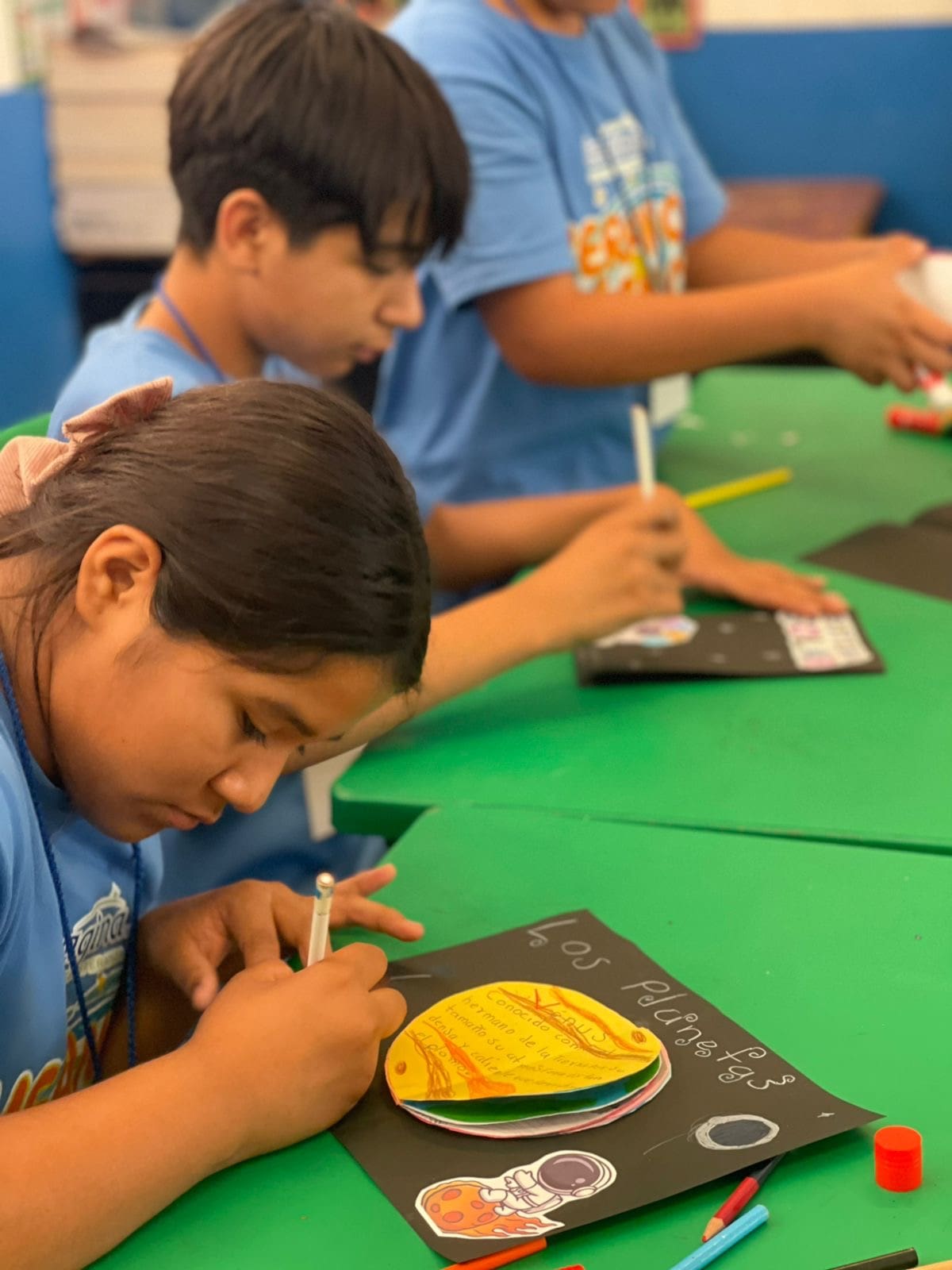 Grupo de niños trabajando juntos en una mesa, haciendo manualidades en una sesión grupal de creatividad.